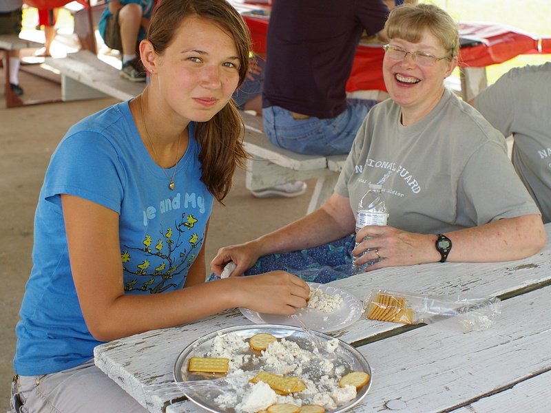 Samantha Stayer (at left) enjoying some fine goat cheese at the picnic, along with her parents Lindy (KC0ROZ) and Carl (AC0CM), joined by Ann (KD0JNI, at right).