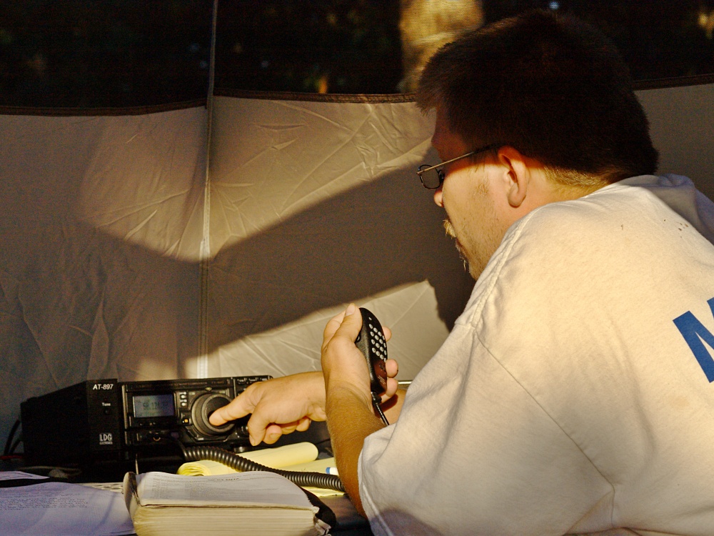 Tim (KC0PCE) making an SSB contact - viewed through the screen of the tent window